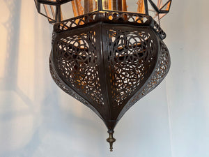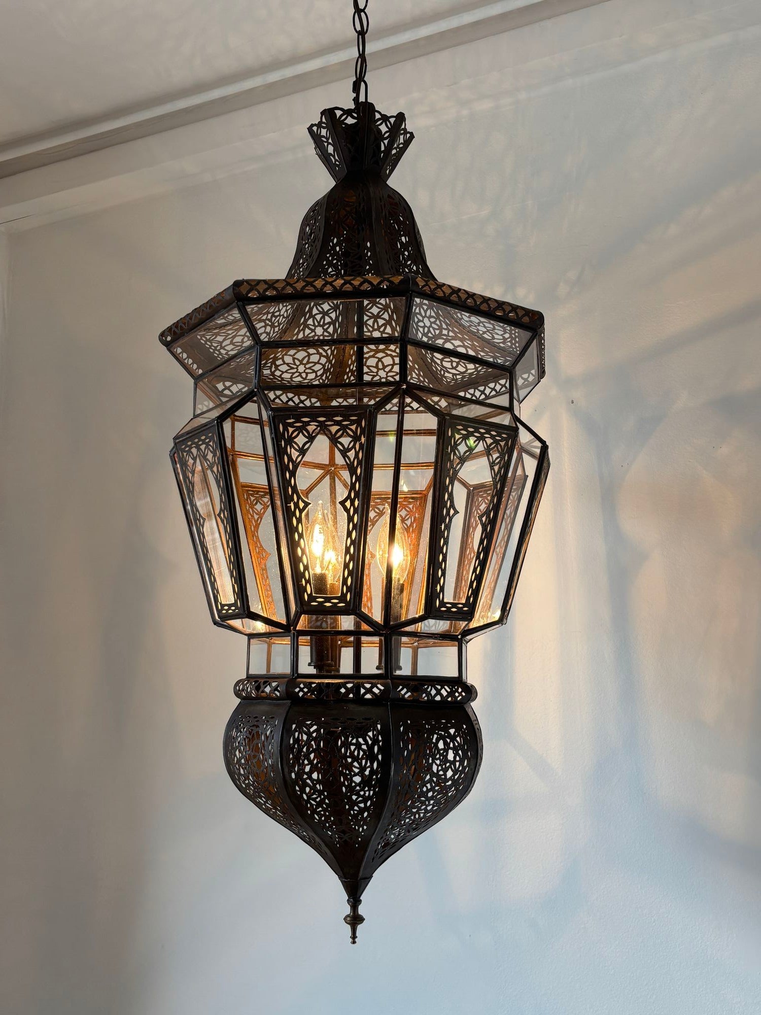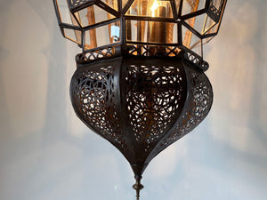 Moroccan Moorish vintage clear glass with intricate metal filigree hanging chandelier.