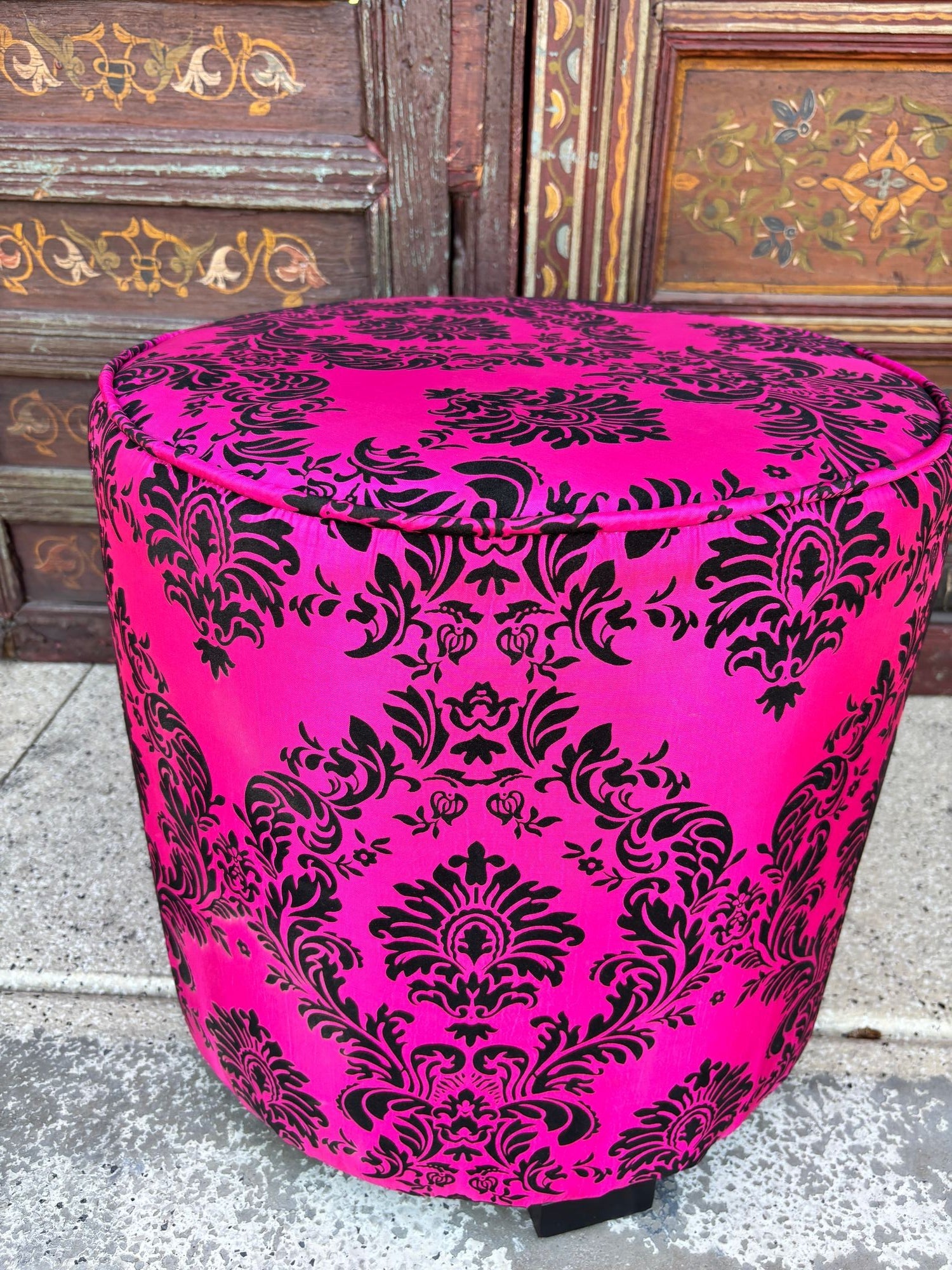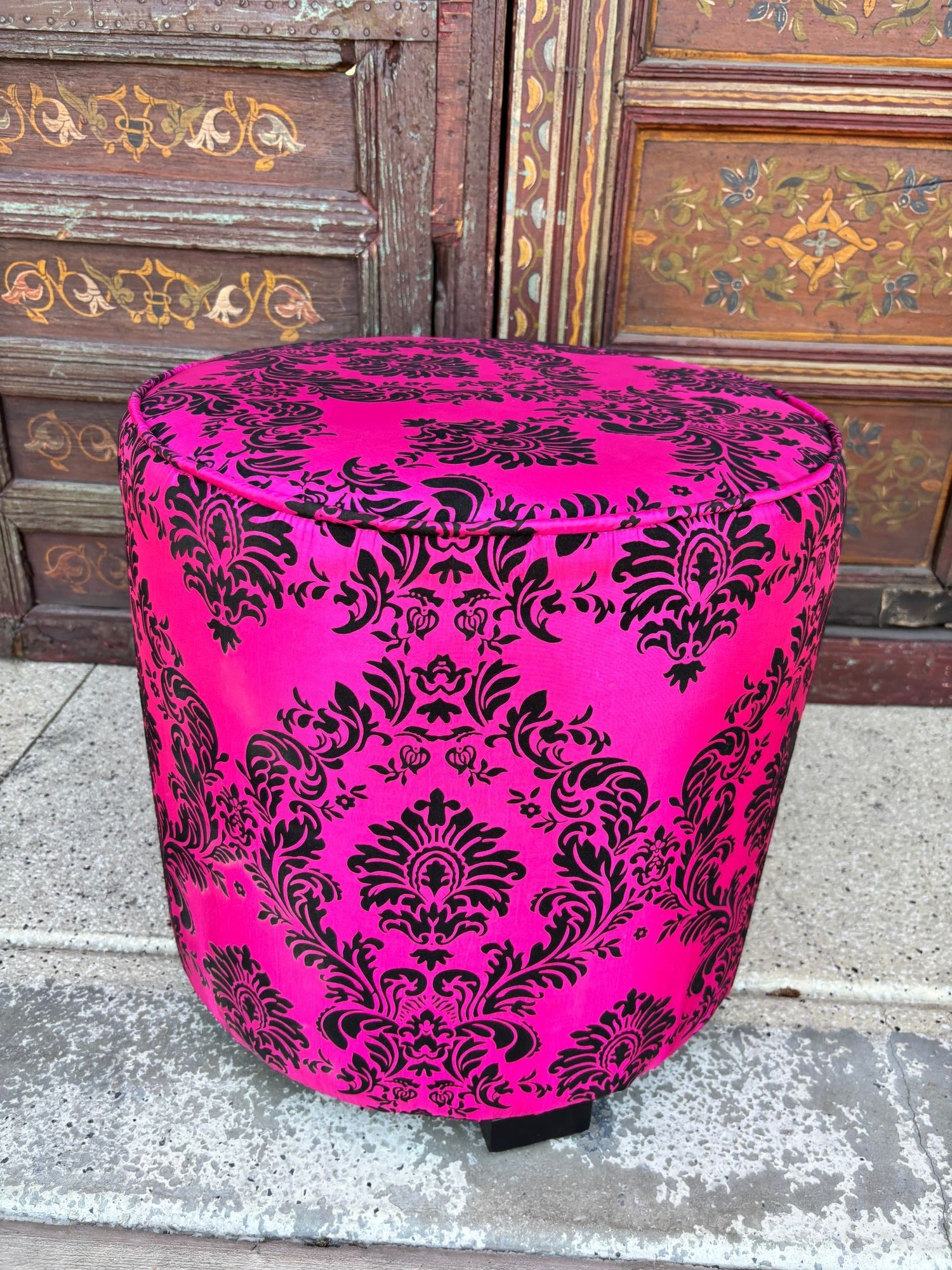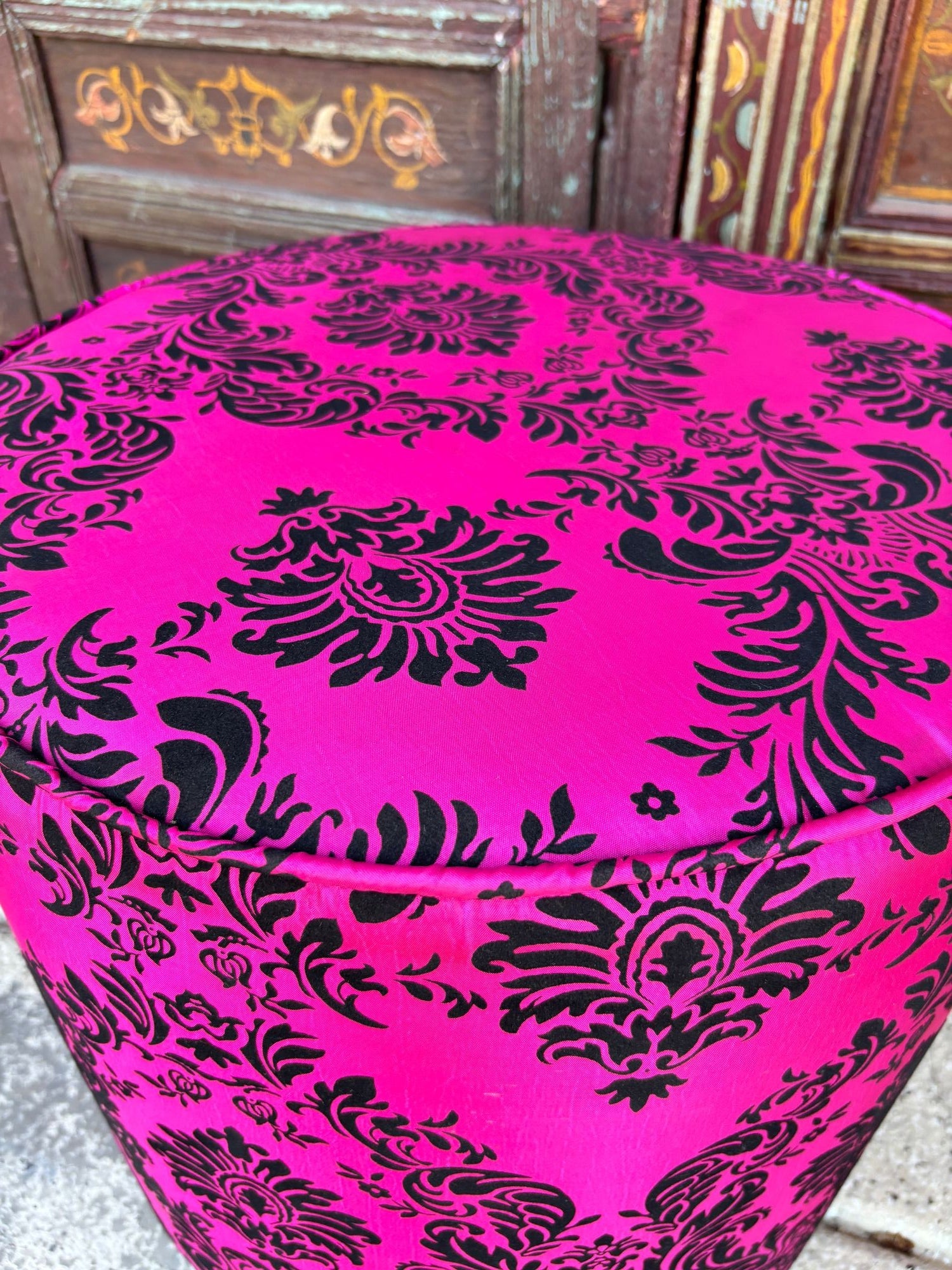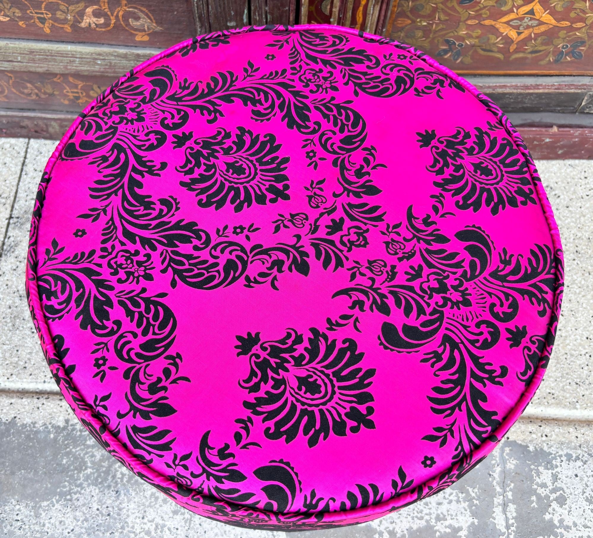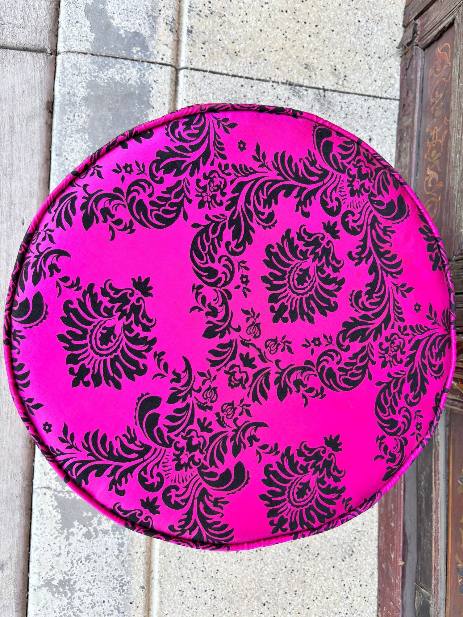 A bold and glamorous Moroccan round ottoman or vanity stool in vivid fuchsia pink with black velvet damask upholstery, featuring a raised floral taffeta texture. This striking piece channels both 1960s hippie chic and Hollywood Regency glamour, making it a perfect statement accent for eclectic and bohemian-inspired interiors.