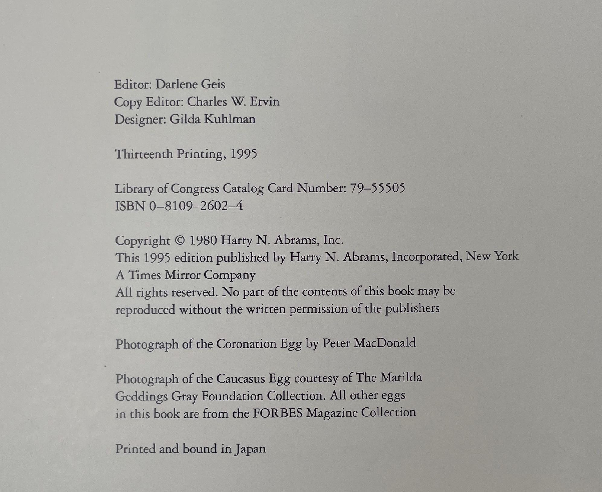A visually sumptuous presentation of the famous - and very rare Fabergé Eggs, those being the bejeweled artworks produced under the supervision of Peter Carl Fabergé between 1885 and 1917. 57 of these survive today, though there may have been as many as 69 - of which 50 (43 surviving) were made for the Russian Tsars Alexander III and Nicholas II as Easter gifts for their wives and mothers. The color photography by Stein and line art by Gershey herein are extraordinarily enchanting