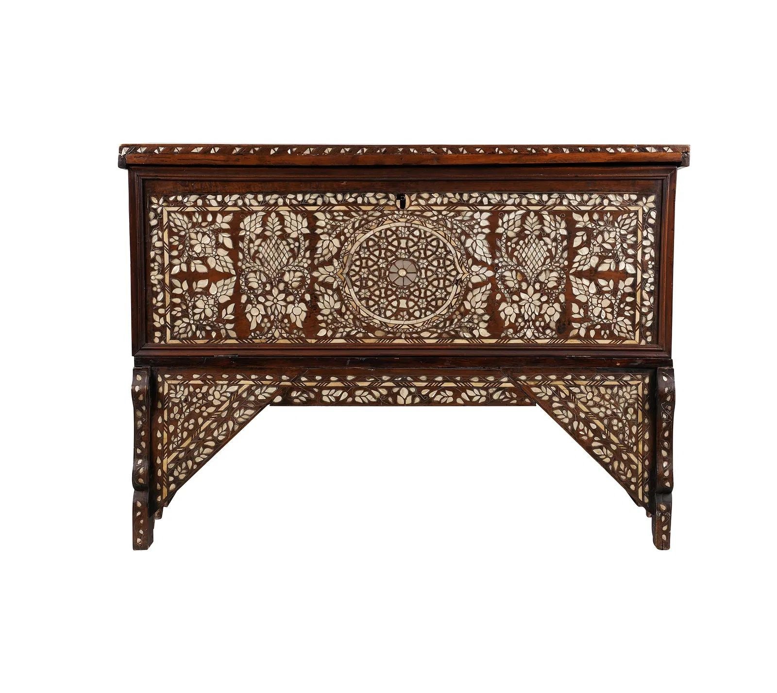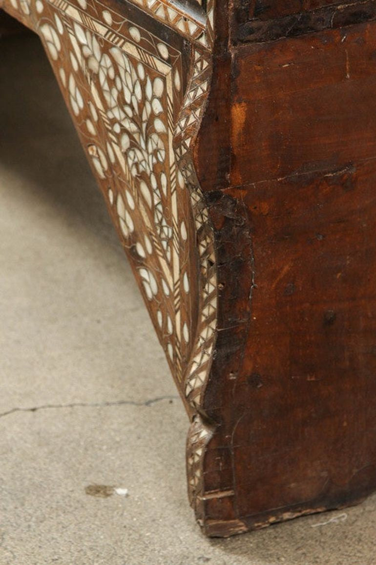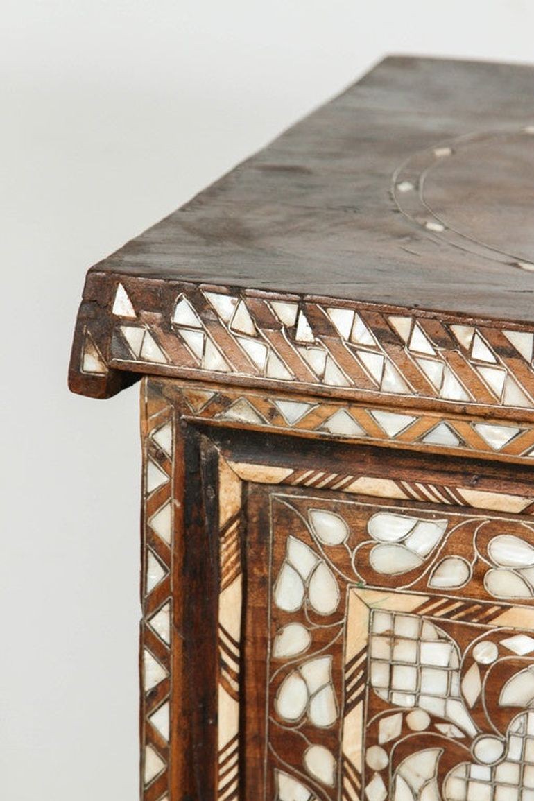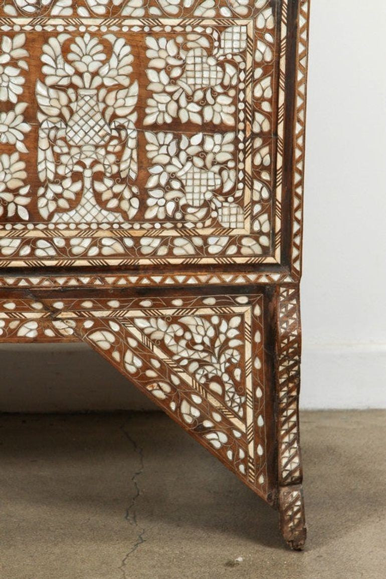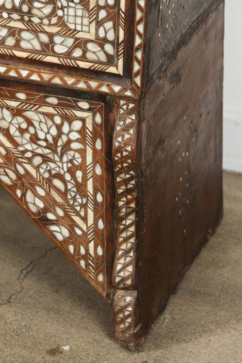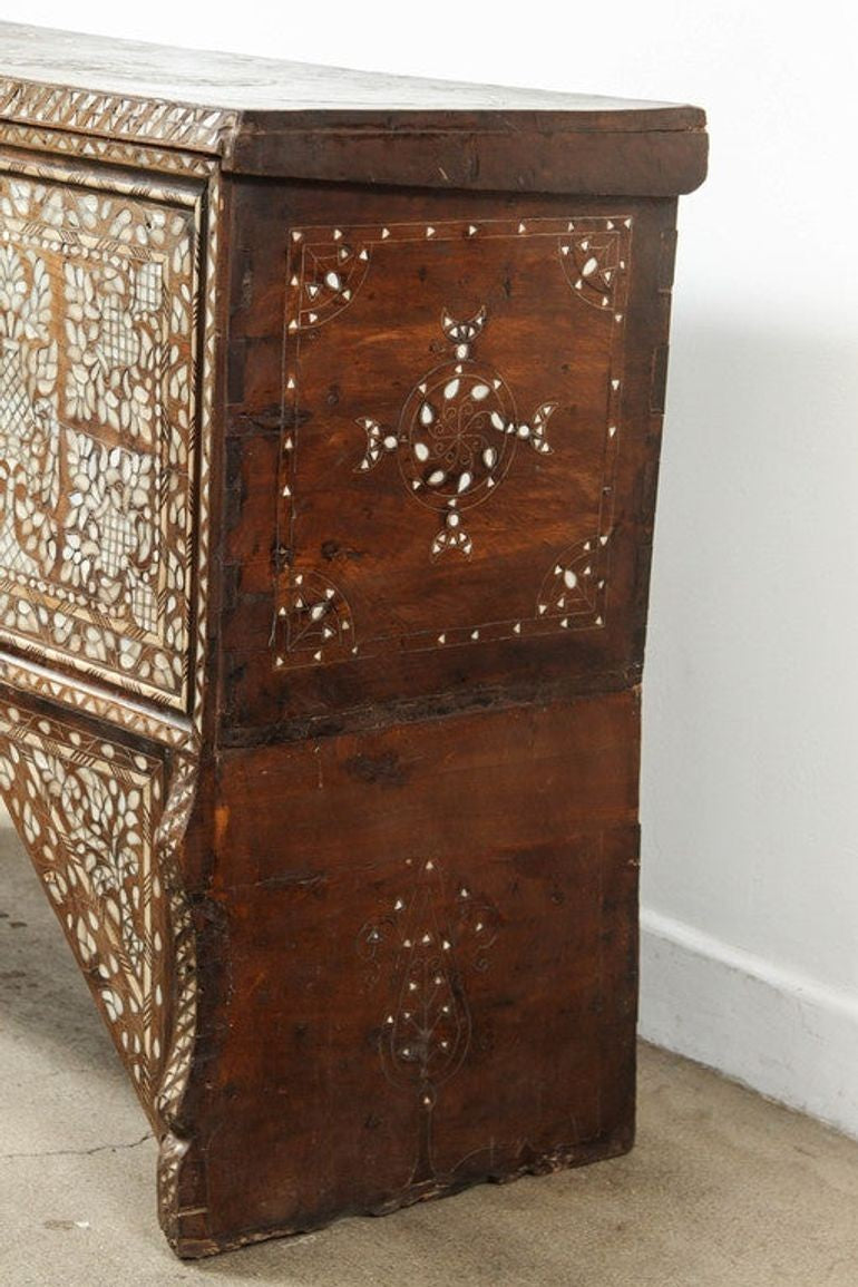 Rare antique 19th century mother of pearl inlaid Syrian blanket wedding chest. Very fine intricate, detailed, stunning craftsmanship quality of Syrian Moorish artwork. Unusual ottoman Empire Syrian wedding trunk decorated overall with Islamic geometric patterns of intricate inlay of and mother-of-pearl.