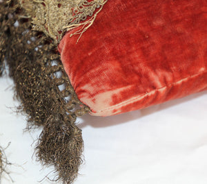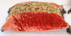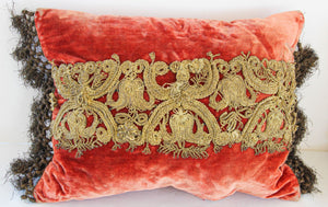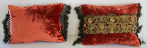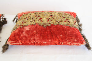 Pair of burnt orange Moorish silk velvet pillow hand with gold threads.
