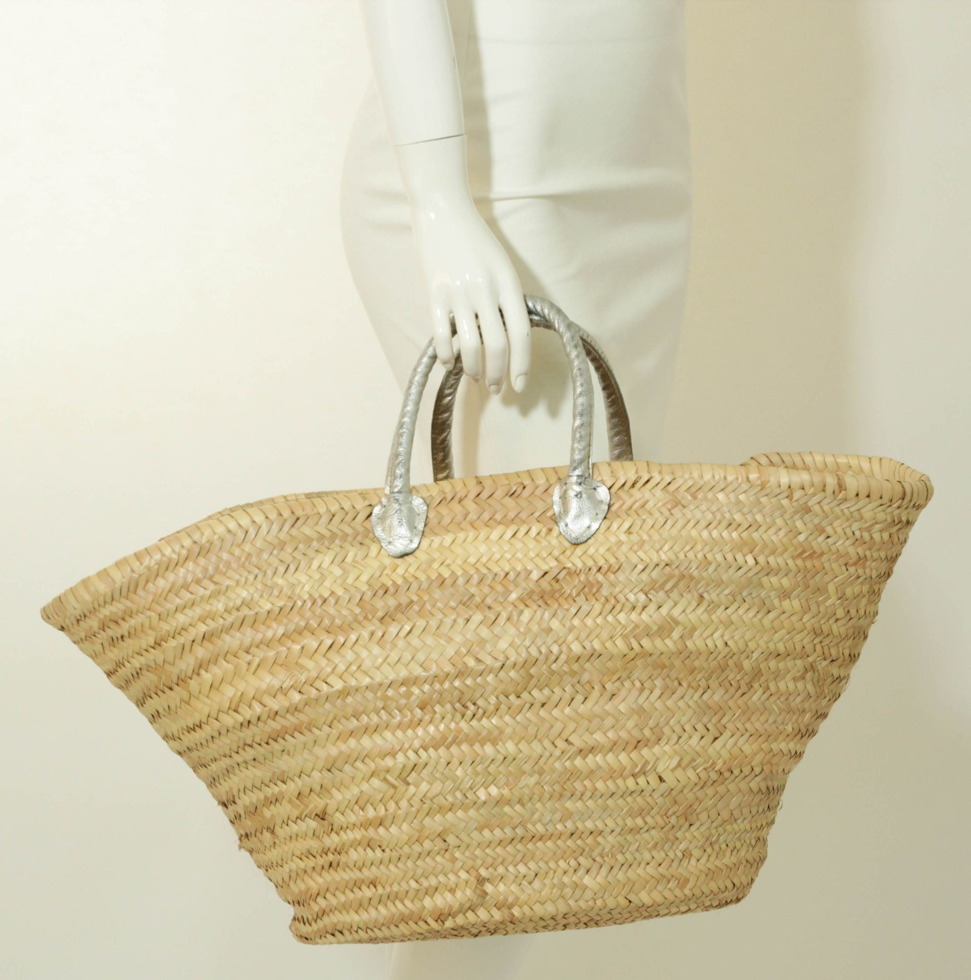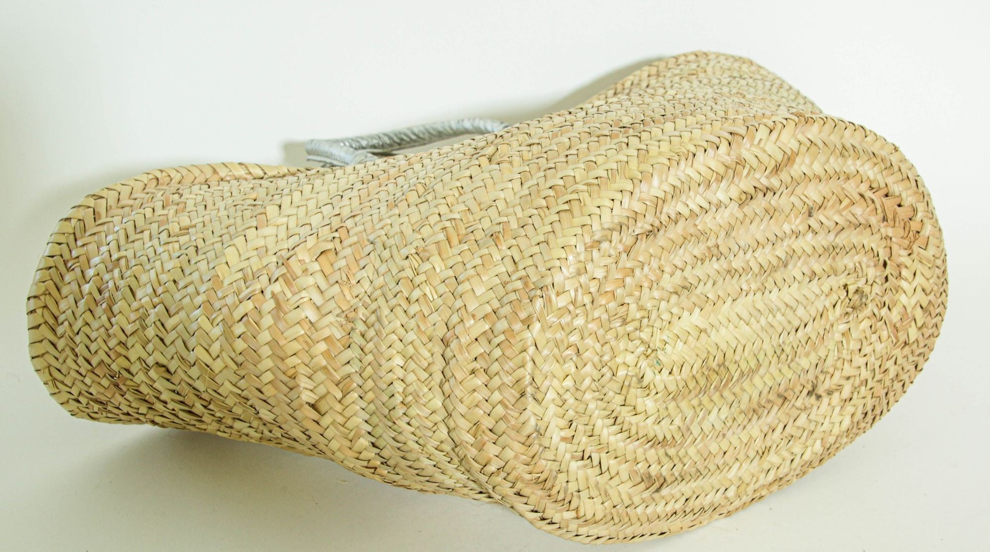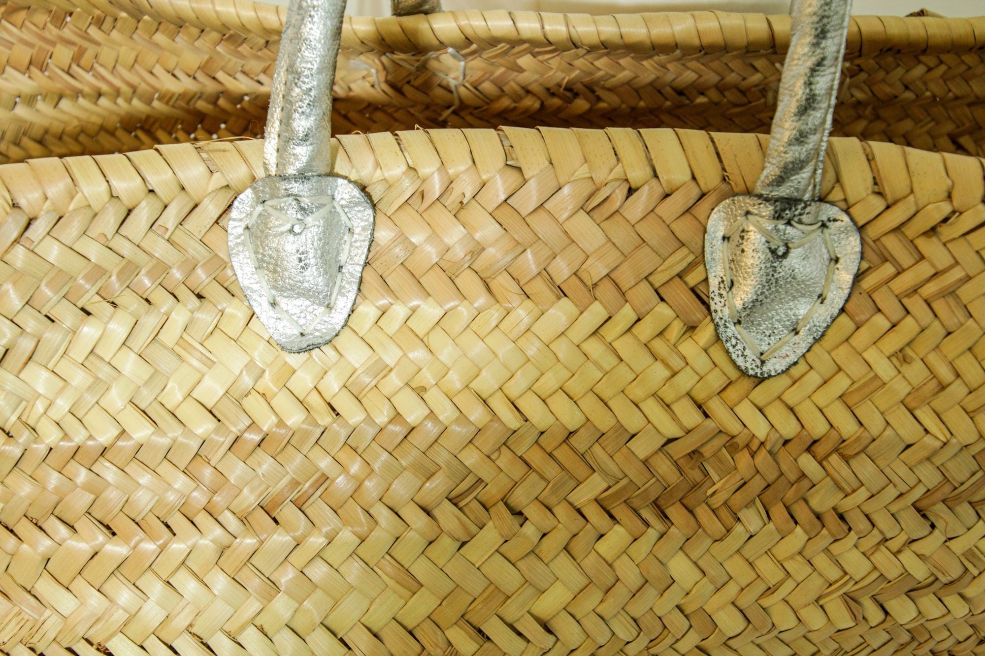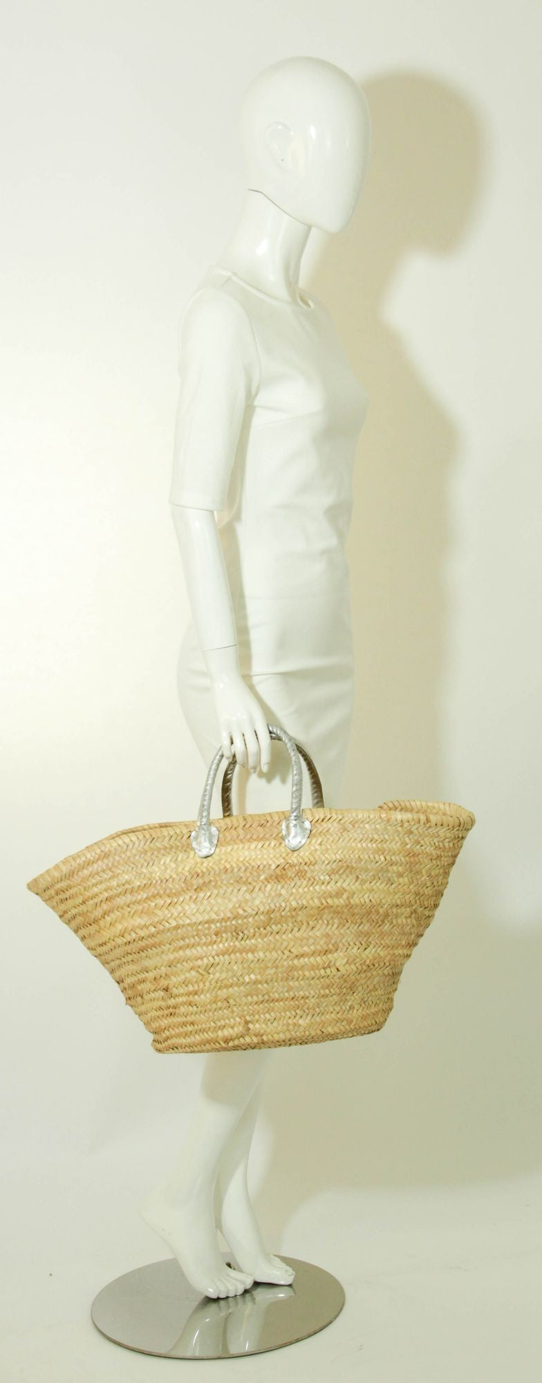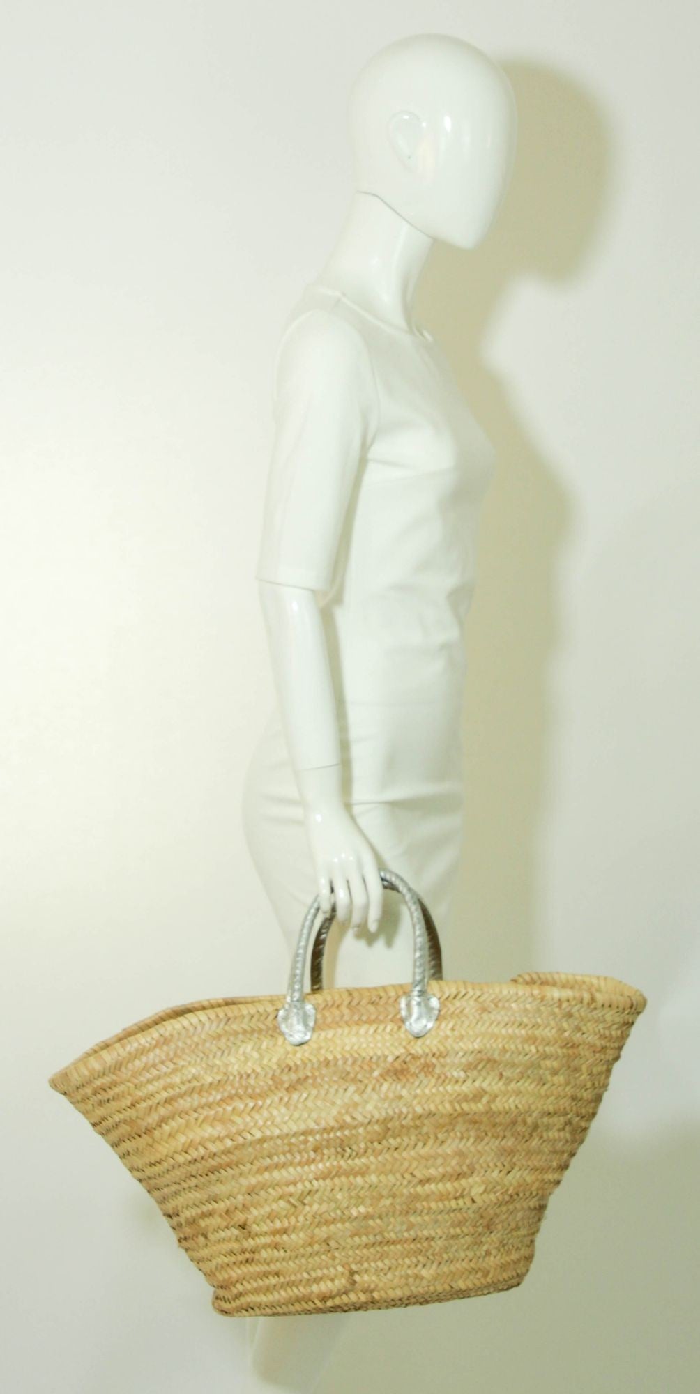 French Moroccan Straw Basket Tote Bag with Silver Leather Handles.