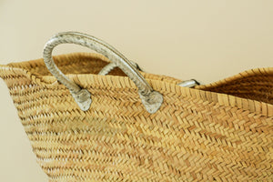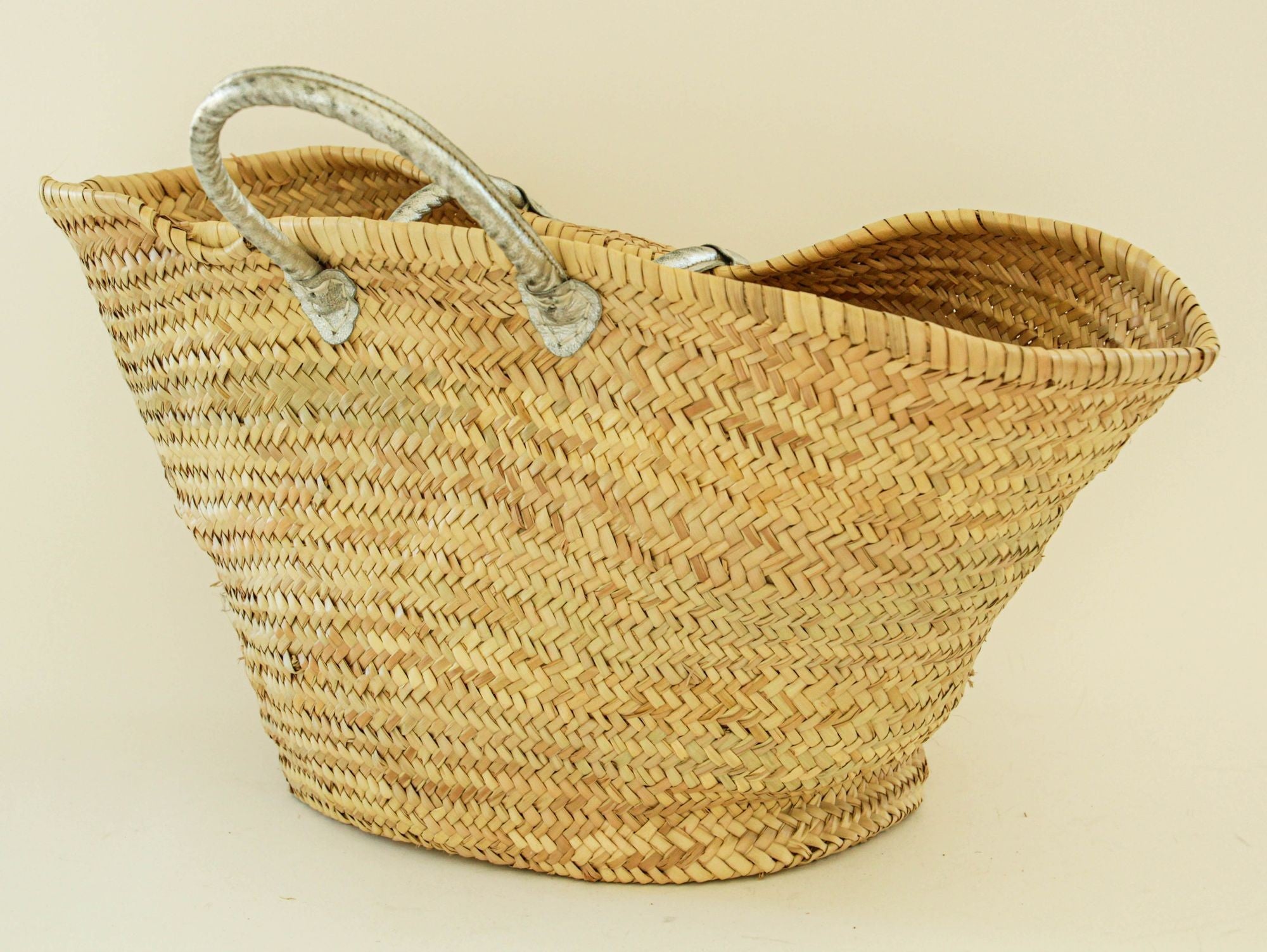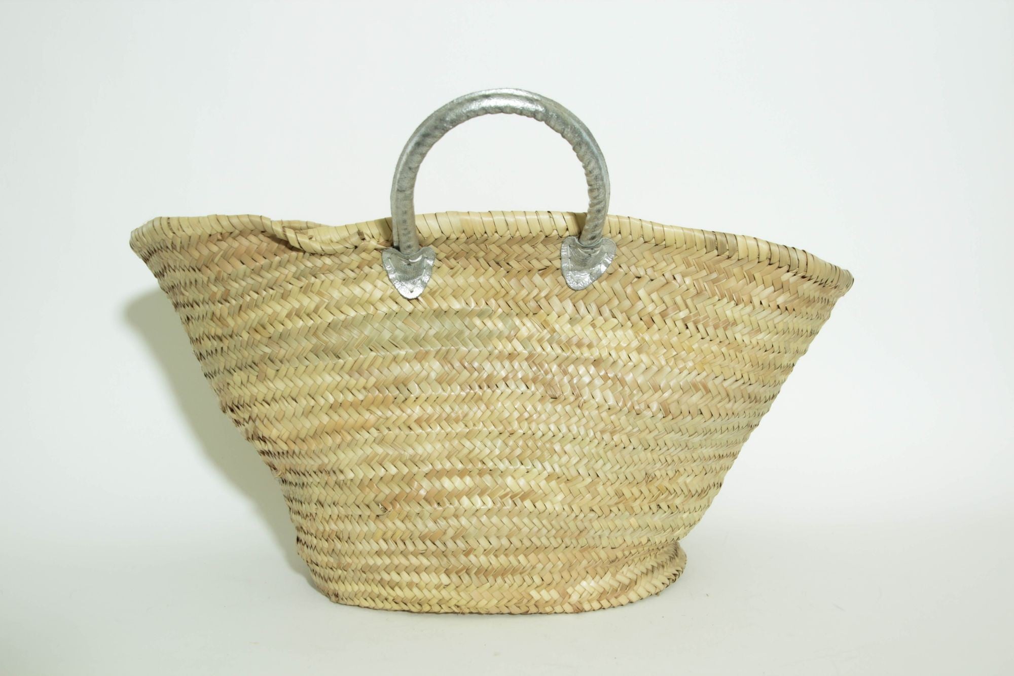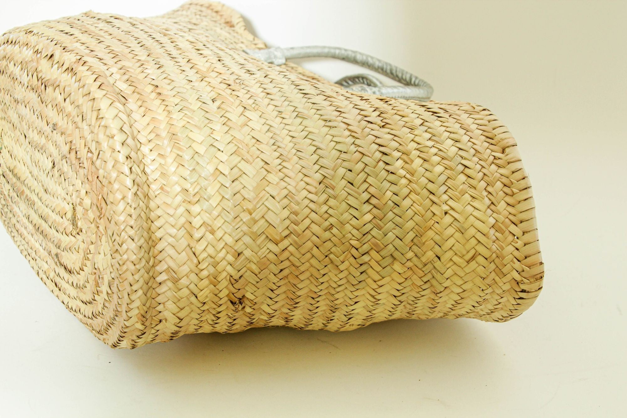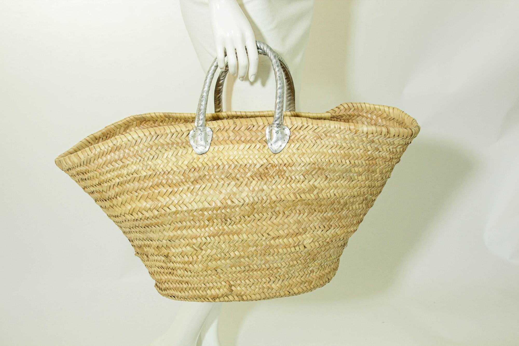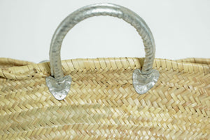 French Moroccan Straw Basket Tote Bag with Silver Leather Handles.